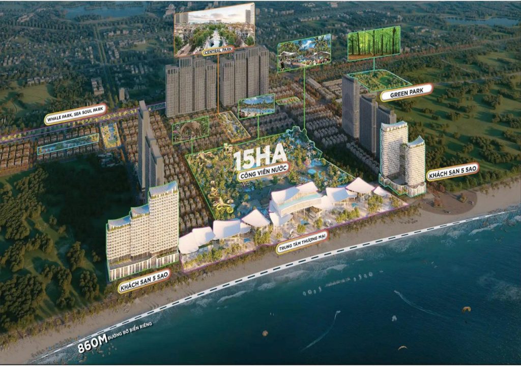 Quy hoạch đồng bộ theo tiêu chuẩn đô thị hiện đại với mật độ xây dựng chỉ 28%, tầng cao tối đa 40 tầng, ưu tiên phát triển mảng xanh, công viên mở, quảng trường cộng đồng. Dự án được định hướng trở thành trung tâm du lịch – thương mại – cư trú kiểu mẫu của thành phố biển trong tương lai.